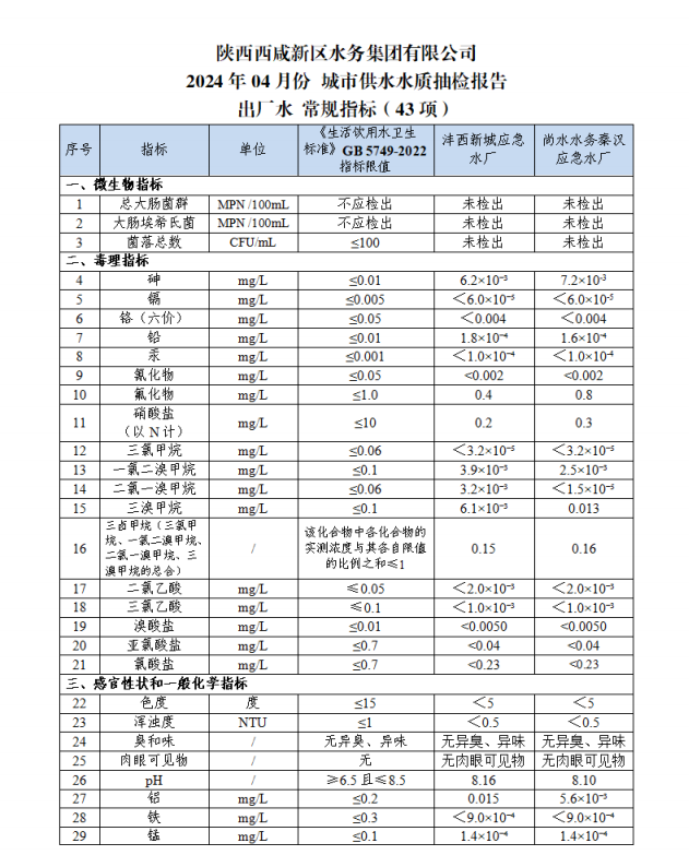 西咸水務(wù)水質(zhì)信息公示報告(2024年4月)